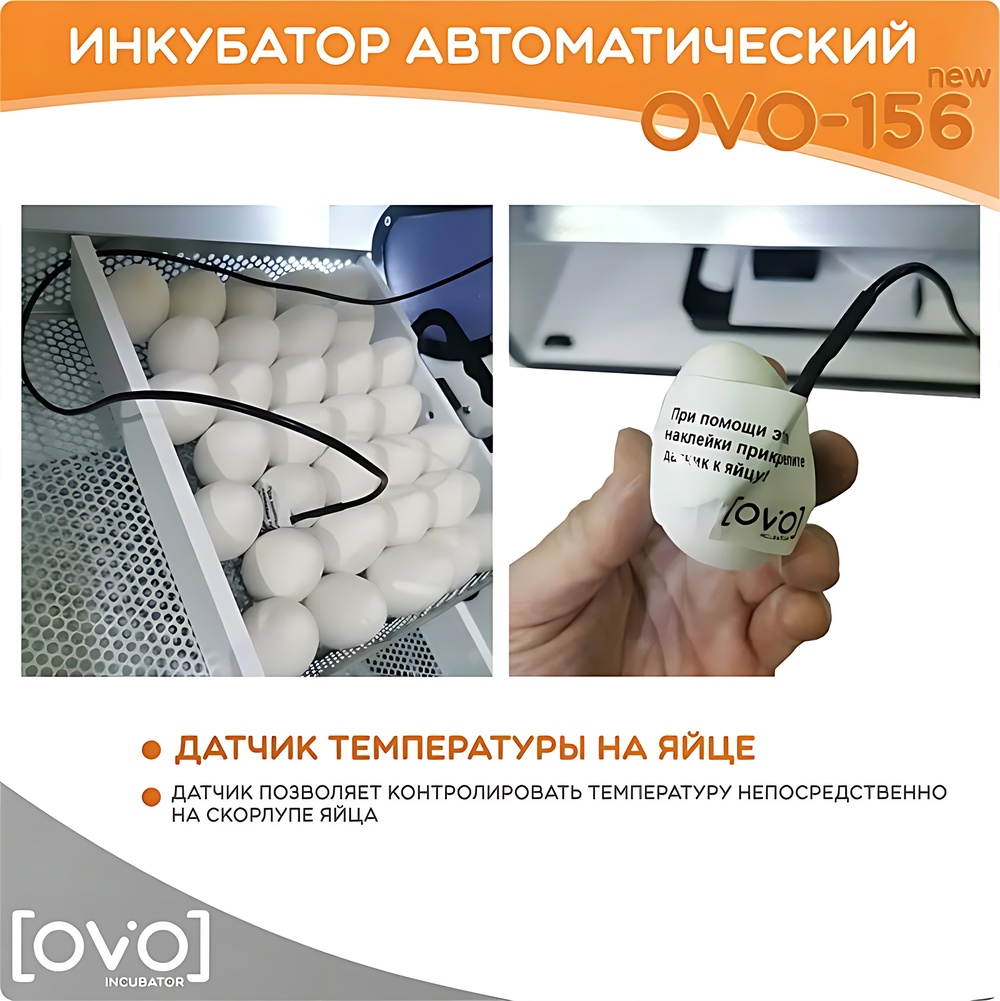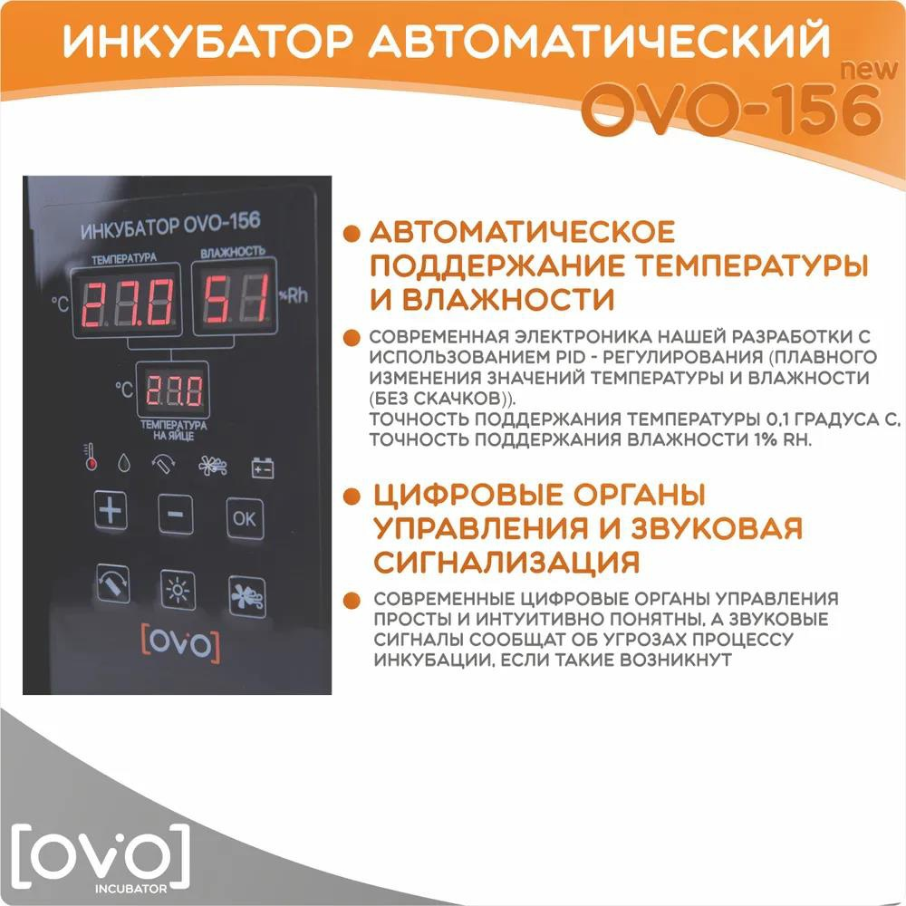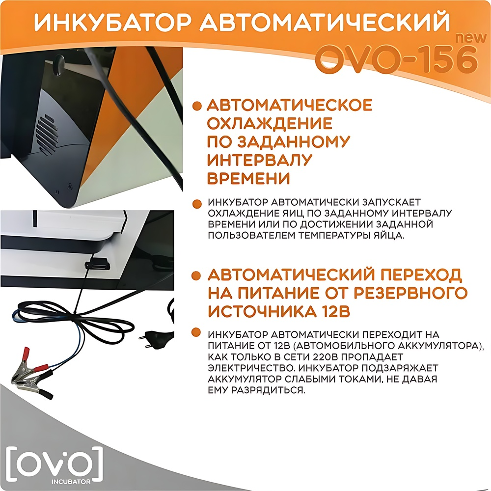 OVO-156 new — это обновлённый автоматический инкубатор нового поколения с расширенными функциями: датчик температуры на яйце, автоматическое охлаждение по заданному интервалу времени и счётчик дней.