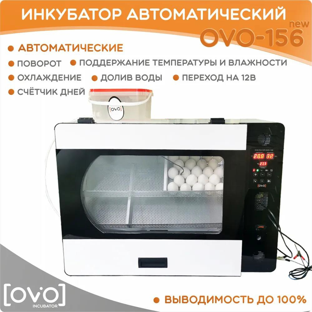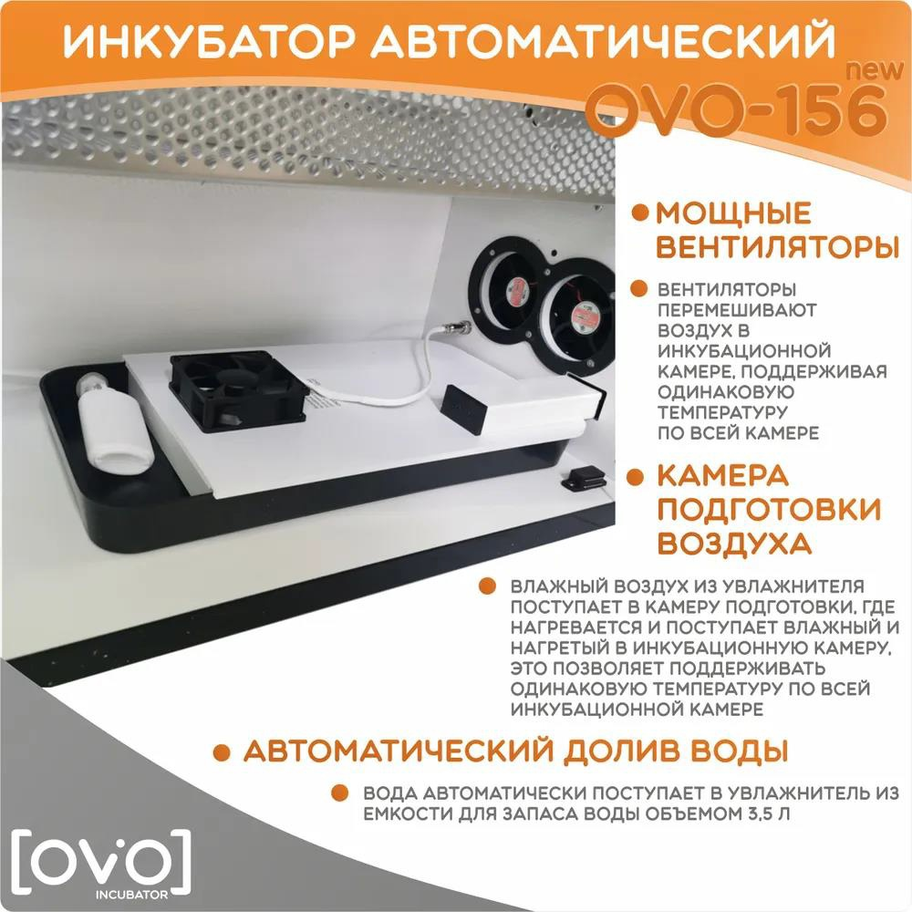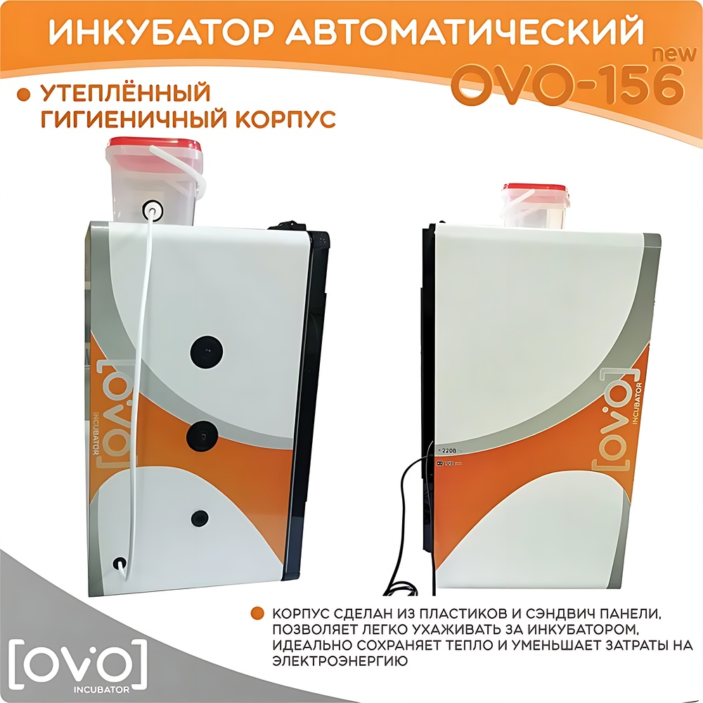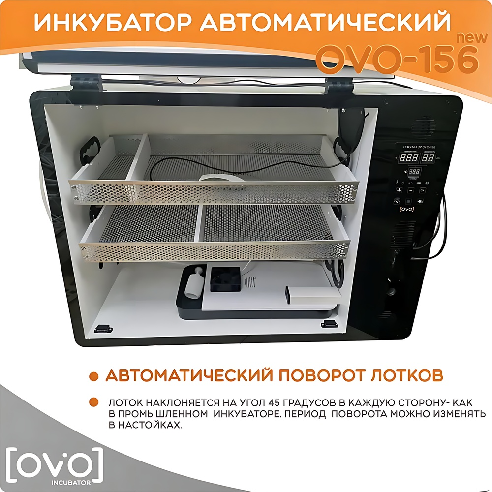 OVO-156 new — это обновлённый автоматический инкубатор нового поколения с расширенными функциями: датчик температуры на яйце, автоматическое охлаждение по заданному интервалу времени и счётчик дней.